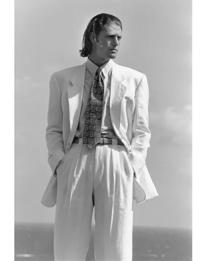 First off, none of the cuts are right. Pants should be higher-waisted to come off as 90’s, and the blazers are also too slim. Since we already seem to be shooting more for early 90’s, I would also throw in some double-breasted looks for good measure.
