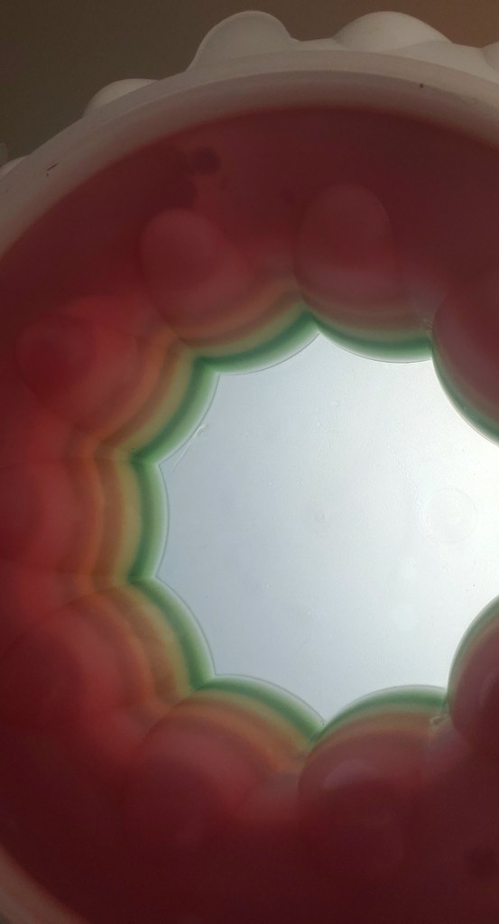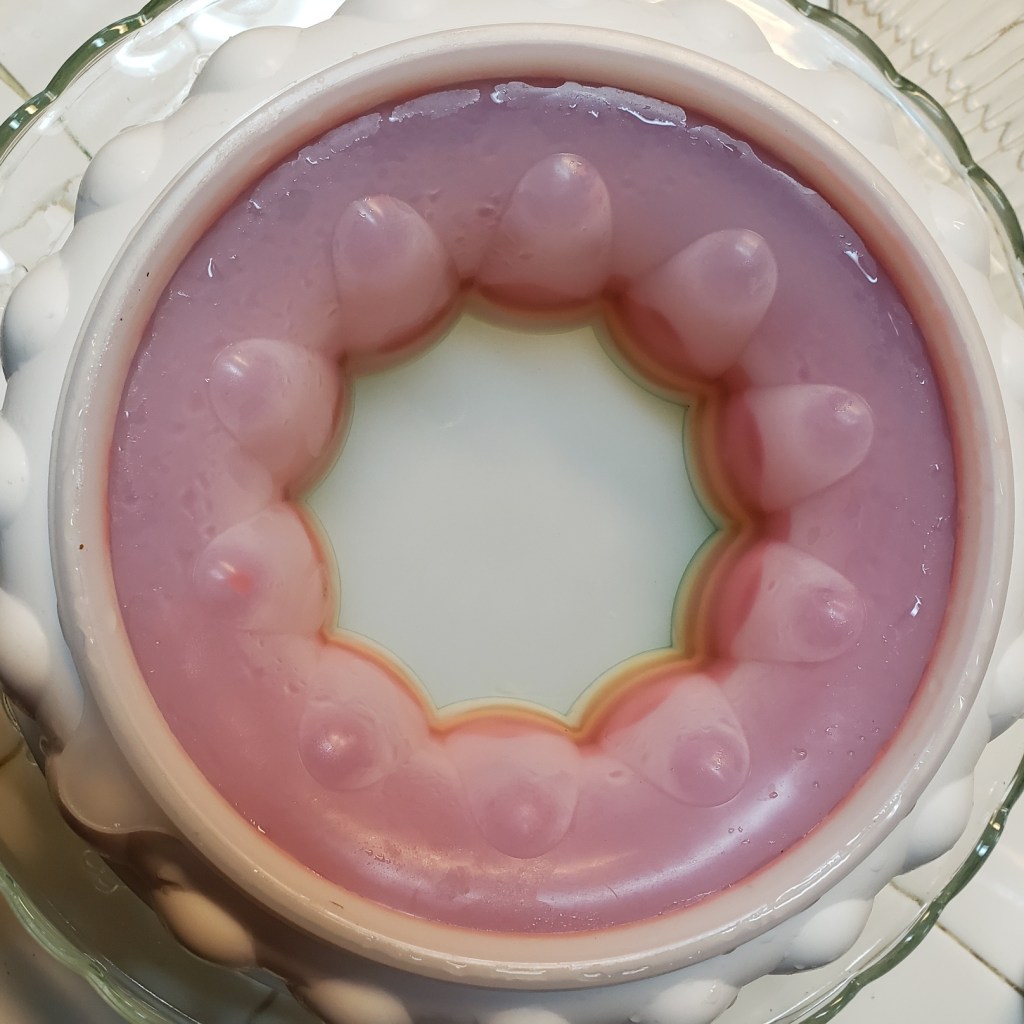 You see, the very first thing I did was check to see what type of mold I needed. The recipe states quite clearly “6-cup ring mold”, and luckily I happened to have that exact size and shape in my Box o’ Molds. But by the time I got three colors poured, I began to suspect my mold might overfloweth. Double-checking the recipe, the first thing I see is 6 ¼ cups boiling water.
