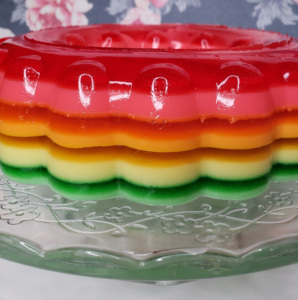 During Bay Area Kei’s Jelly July, I solicited requests for gelatin desserts on an Instagram story, and a friend of mine volunteered “rainbow ribbon mold”. I decided against it at the time, because it’s a Giant Pain in the Ass. But here we are in a month where there’s rainbow stuff (well, prolly not people’s first guess for ‘rainbow month’, but still). So why not?