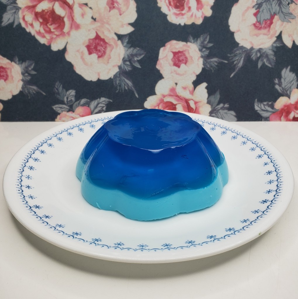 Next up is the colors. If using Jell-o brand mix, Blue and Green only have one possibility: Berry Blue and Lime, respectively. As I’ve mentioned in previous gelatin blogs, Berry Blue only really exists to be The Blue Flavor. There’s a picture of a strawberry and a couple blueberries on the box, but it just tastes of blue. Think cotton candy, or Japanese ‘soda’ flavor.