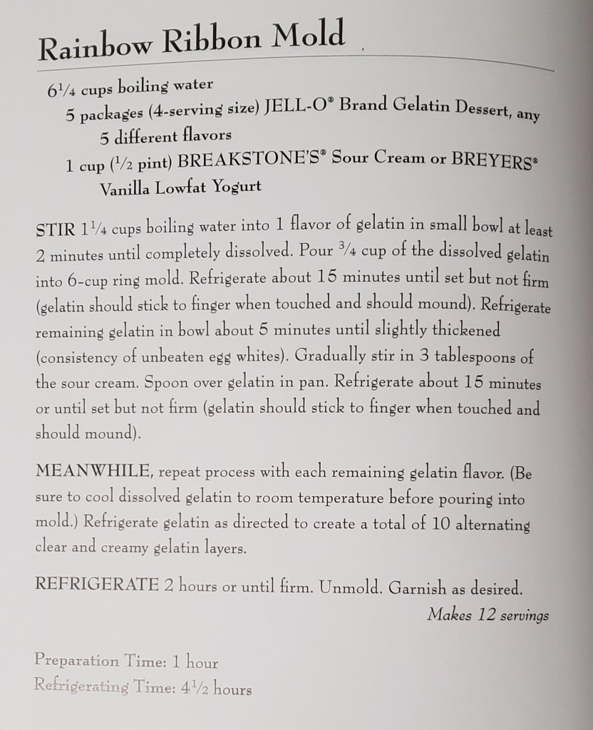 There are lots of recipes available online for a rainbow ribbon mold, but I decided to use the one in my Jell-O Classic Recipes book, and That Was A Mistake.