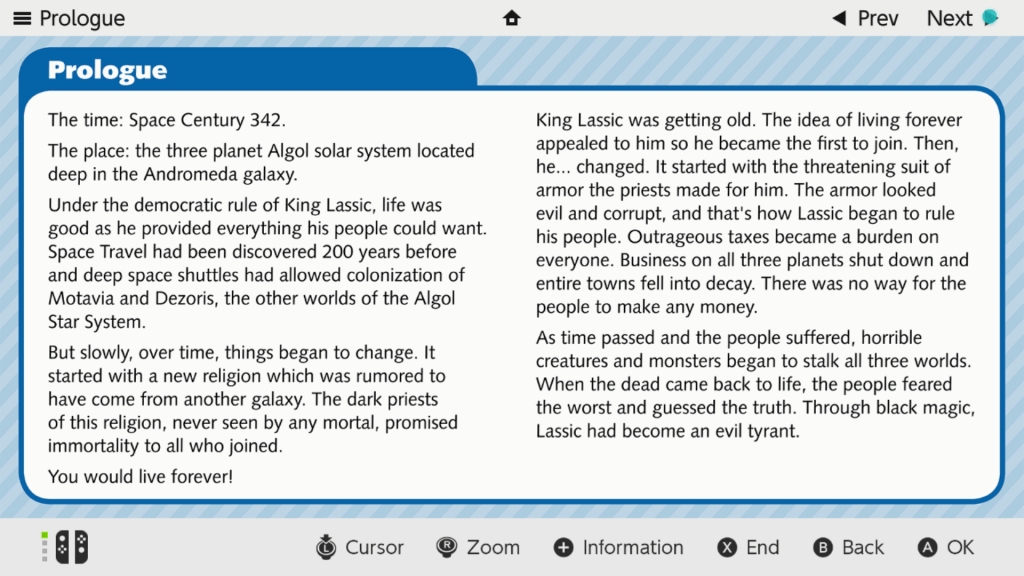 After playing Picross S: GENESIS & Master System edition, I felt like I should play one of the games featured. Most of the arcade ports were a hard no, and other games I was interested in weren’t necessarily easily available. But Phantasy Star had a well-reviewed port on sale for $3.99 right in the Nintendo Switch eShop! Bonus: sources online claimed it would only take about twenty hours to finish, and they were right!