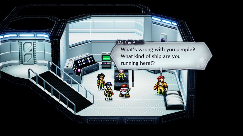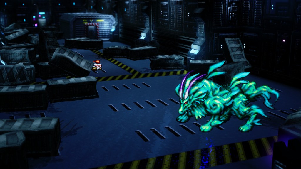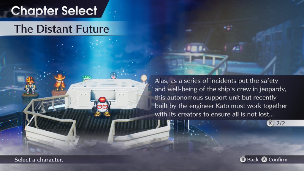 I started with the Distant Future chapter, which features no combat besides the Final Boss. Instead, you’re a cute little robot on a terribly-managed spaceship.