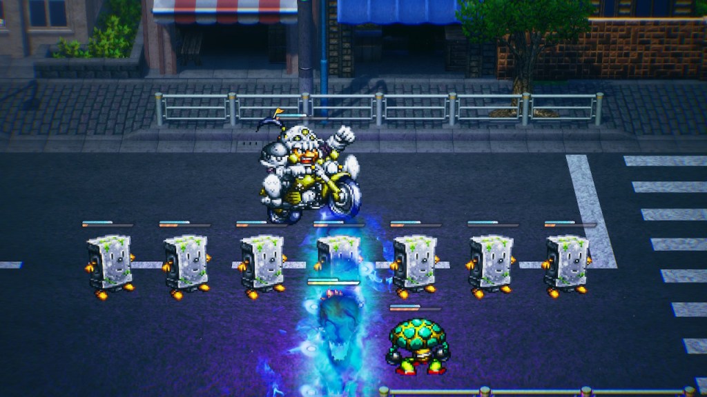 While random encounters are generally avoidable, certain areas of the game make it difficult or impossible to avoid optional battles. Once in a battle, it can be a bit slow to clear enemies even if you’re overleveled, due to lengthy, flashy attack animations. And I mean literally flashy – I wouldn’t just like the option to turn off or simplify animations for speed, but also to reduce eye strain. (There’s also screen flashing every time a boss is defeated, which at least was somewhat predictable.)