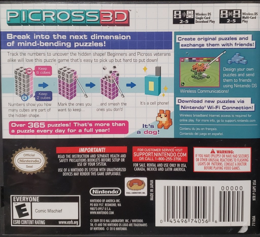 To preface, I do think, as some have suggested in my stream chat, I am too hard on Voxelgram. I want to really emphasize this is primarily a consequence of just how great Picross 3D is. I’ve found in my experience of playing ‘offbrand’ nonogram games that they often fall extremely short of the expectations Picross, or more specifically, the developer Jupiter, has set. For example, they often have a barebones UI, with little to no quality-of-life. But even worse, sometimes they just don’t…work. I watched a little bit of an interview with the developers of one of these disappointing games, and they really seemed very enthusiastic about making a nonogram game…and not much else. My current theory is people just really underestimate how difficult it is to make one of these, and a 3D version is going to be even harder. That HAL Laboratories of all people managed to do so isn’t surprising, given their track record, but that’s like, the caliber it might take.