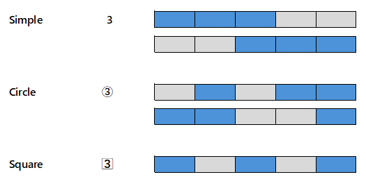 A bit more concerning was how they chose to display numerical information. Here’s where I get deep in the weeds. Picross 3D had three types of solves, which I’ll call Simple, Circle, and Square. Let’s look at a quick and dirty graphic to get an idea.