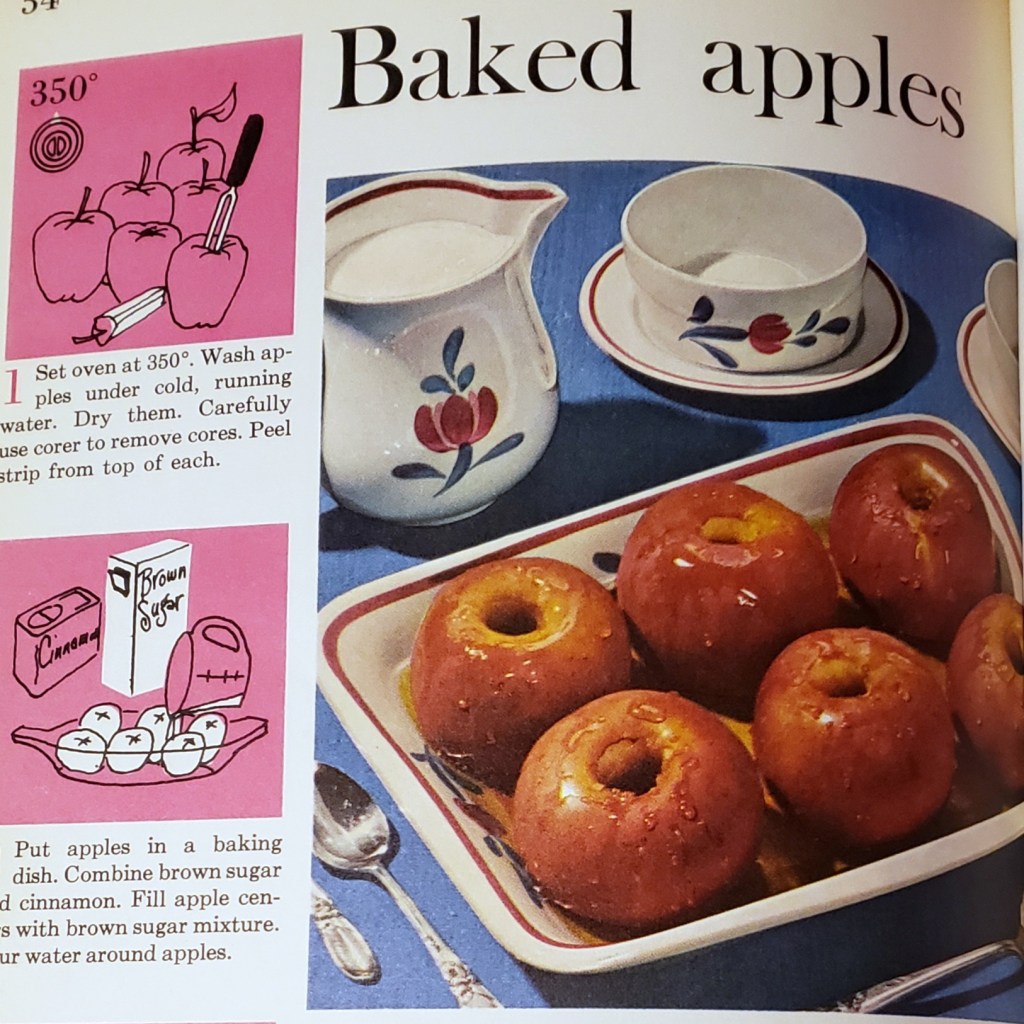 I had kind of forgotten about apples, honestly. Mainly because I don’t enjoy their common kid-friendly(?) seasonal forms of ‘caramel’ and ‘candied’. There’s even a recipe in this book further on for said caramel apples, but yeah. No. Baked apples are simple and delicious, although coring an apple is a bit rough for me, let alone a child. When I placed my baking apple grocery order, my personal shopper was delighted to inform me how much she enjoyed her mother’s baked apple recipe (which apparently sometimes involved dough), and how they really did use to bob for apples at parties, and so on and so forth.