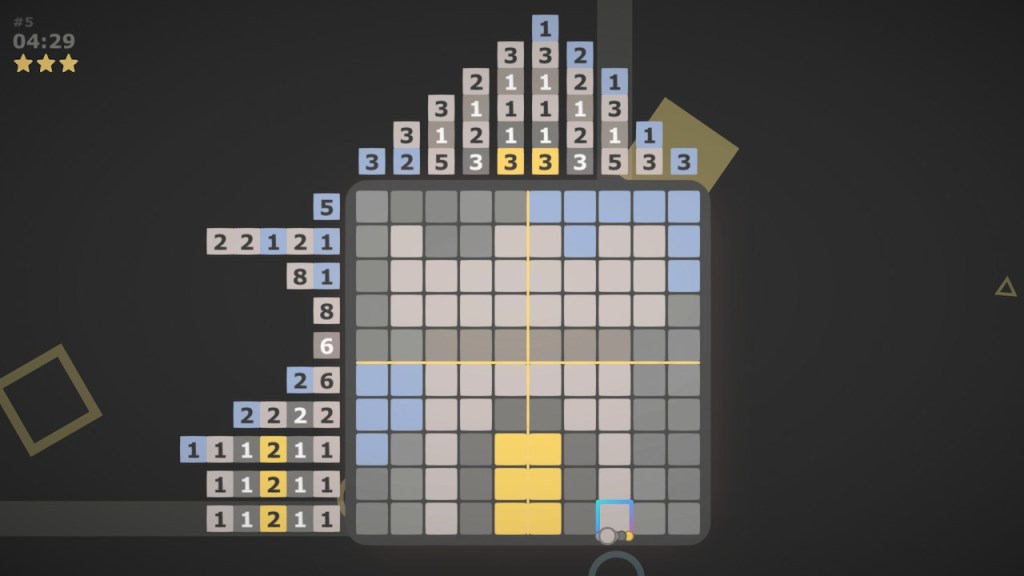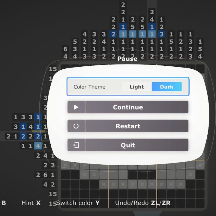 The hint functions are similar to Picross 3D, in that you can toggle showing possible moves and hiding completed numbers – the latter isn’t so much a hint function as QoL, but sure. If you toggle both off, you get the full three stars upon completion. Unlike Picross 3D, however, it doesn’t seem to contribute towards any sort of unlock requirement, and the hint functions provided overlap oddly (showing possible moves basically also shows you completed numbers). It would have made more sense to make the other option a hint roulette, or just have the possible moves option.