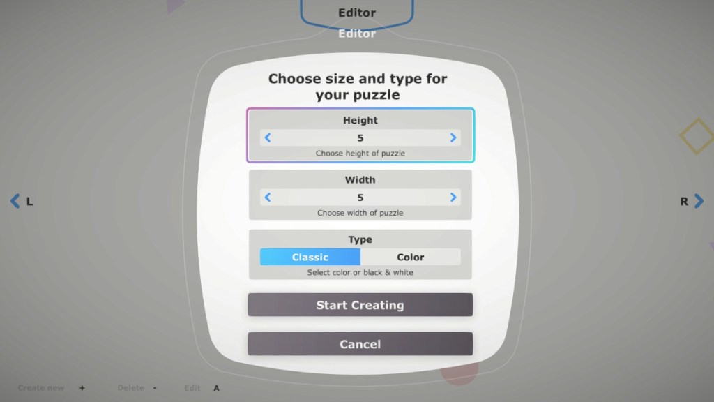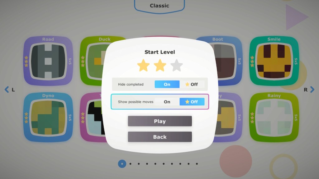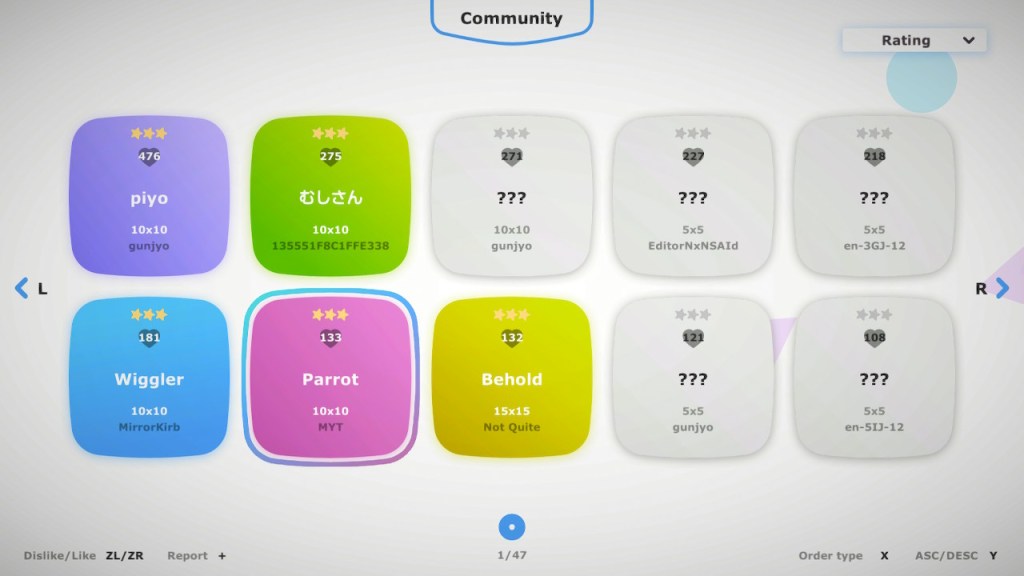 Roughly 470 player-made puzzles are currently uploaded to the Community section, sortable by Most Played, Rating, and Date. How they display the puzzles is a bit confusing there’s no way to tell if it’s a Normal or Color puzzle from the selection screen. Additionally, the number of hearts indicate how many people rated it, with an additive/subtractive system. So if 3 people hit the Like option, but 1 person hit Dislike, it will show 2 hearts. This……ends up being kinda useless, as there’s not really a good way to separate out a puzzle that 210 people liked and 10 people didn’t versus one that 400 people liked and 200 people didn’t.