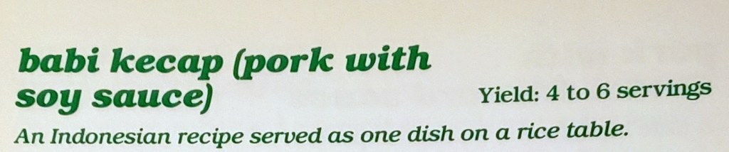 The latter criteria I decided disqualified pheasants in sour cream, as much as I wanted to see how easy it was to find pheasants at my local grocery store. Maybe that could be the complicated part. Before I knew it, I had no clear winner and I was at the end of the savories- well, for me anyways. I’m allergic to fish, so I could skip that section. I left my flagged sections with an explanatory note for my primary taste-tester’s second opinion…and she too was quickly overwhelmed. So I decided to give the ladies of the Junior League a break and make one of the few recipes that did imply some level of cultural diversity – babi kecap.