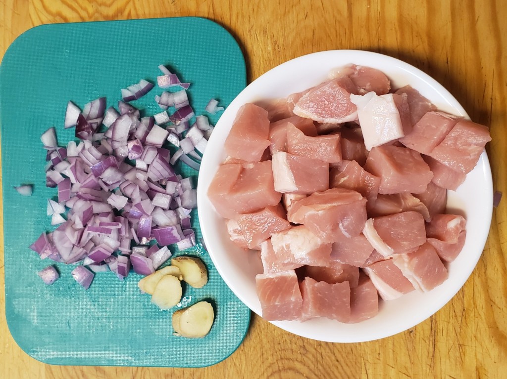 (For me this was about 2 tablespoons of garlic and 1 tablespoon ginger…the latter I would just microplane next time. Much easier.) - Cut the pork into bite-size cubes, and stir-fry them in a large saucepan or wok at high-ish heat until sides are evenly browned.