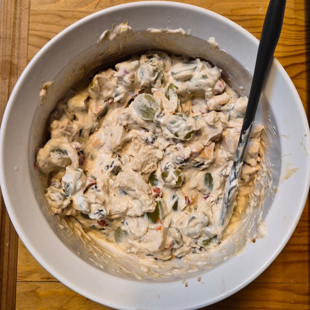 - Original specifies diced, but I feel shredding would eat better. Also, I think 2 heaping cups is the play here – I had prolly more like 1¾ and you had to hunt for the chicken…