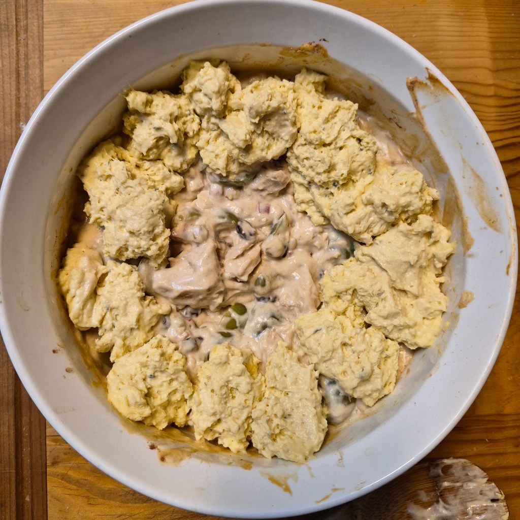 As for the “spices”, I also omitted the cloves cuz there was barely any in the recipe to begin with, and I only had whole ones on my spice shelf. I replaced the celery seed in the drop biscuits with some month’s old desiccated thyme I found in the humidifier drawer. Oh, and I left out the added salt, because I never trust adding salt to recipes with condensed soups. You can always add more later.