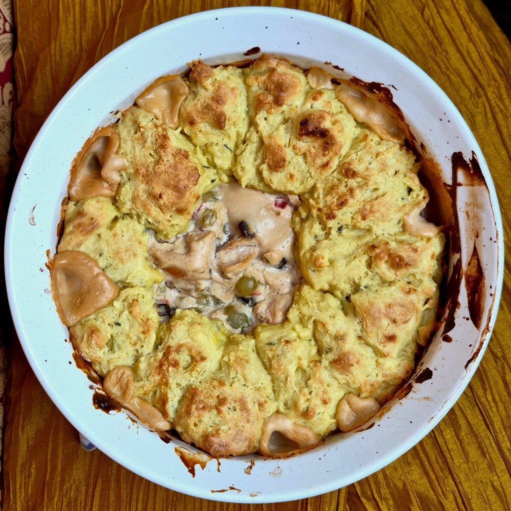 Remove casserole from oven and use a large spoon to drop biscuit dough around the outer edges. Stick back in the 400F oven uncovered for 20~25 more minutes, or until the biscuits have some color on them.